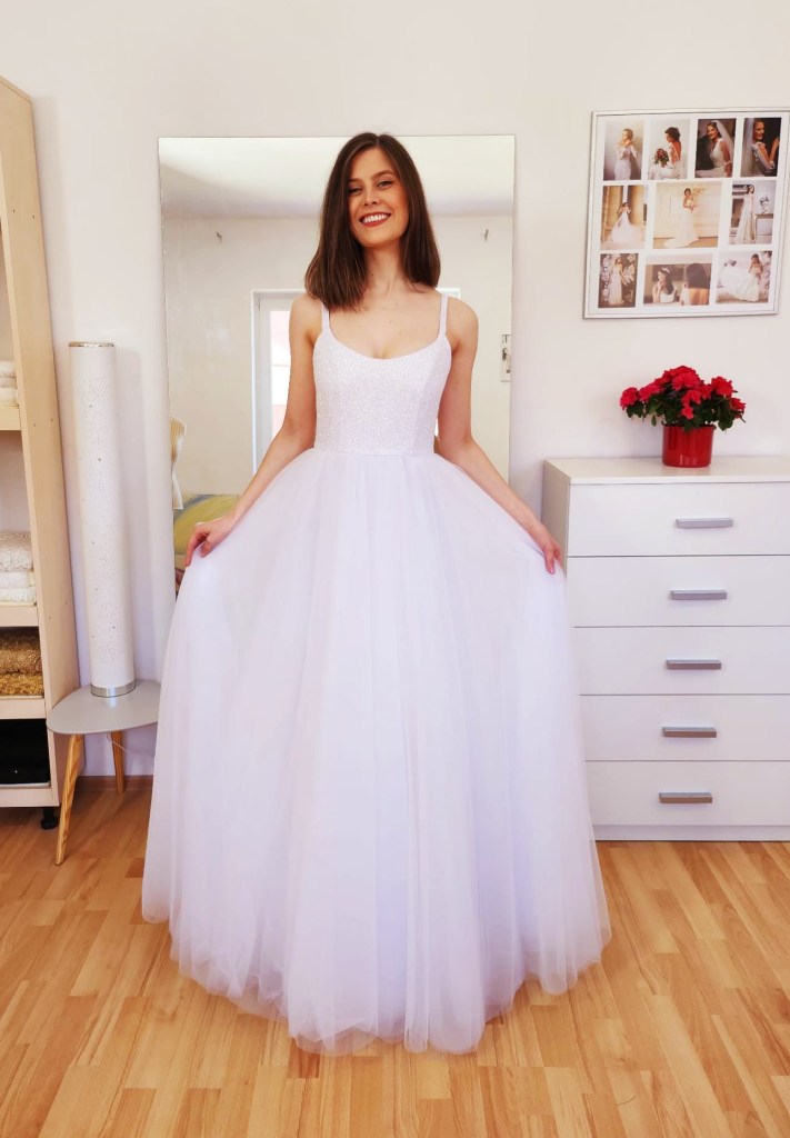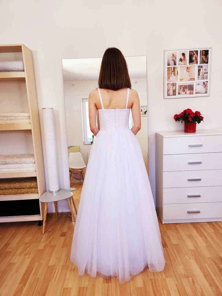 Această rochie de mireasă este realizată din material cu glitter și tulle. Modelul acesta de rochie a fost lansat în 2022 pe mărimea 38 și este disponibil în stoc.