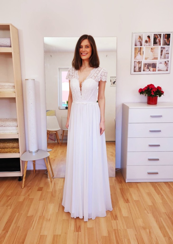 Această rochie de mireasă este realizată din voal și dantelă Chantilly. Modelul acesta de rochie a fost lansat în 2022 pe mărimea 38 și este disponibil în stoc.