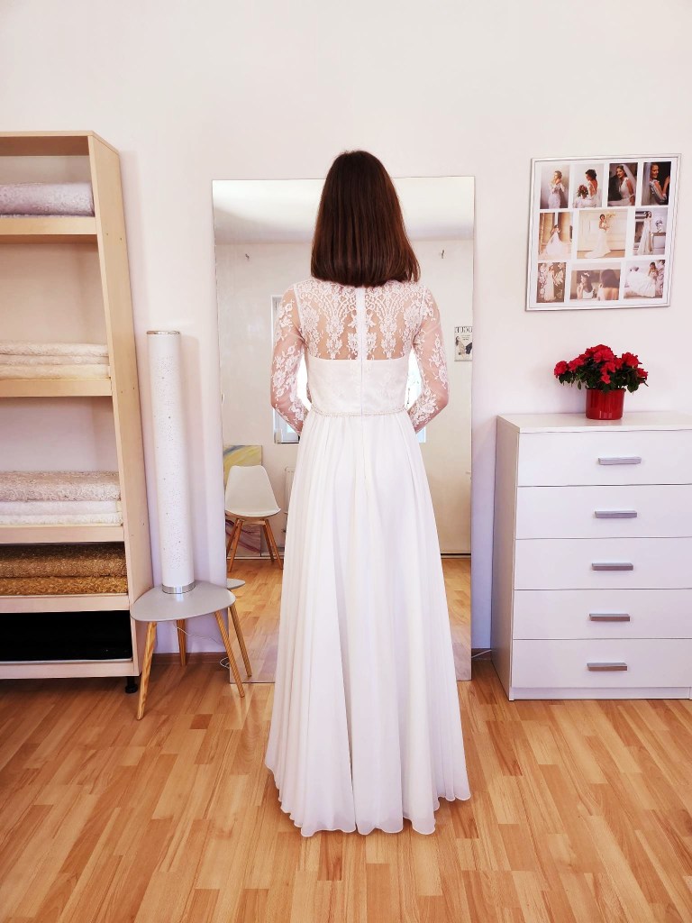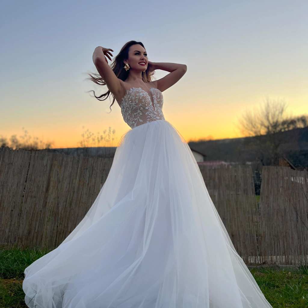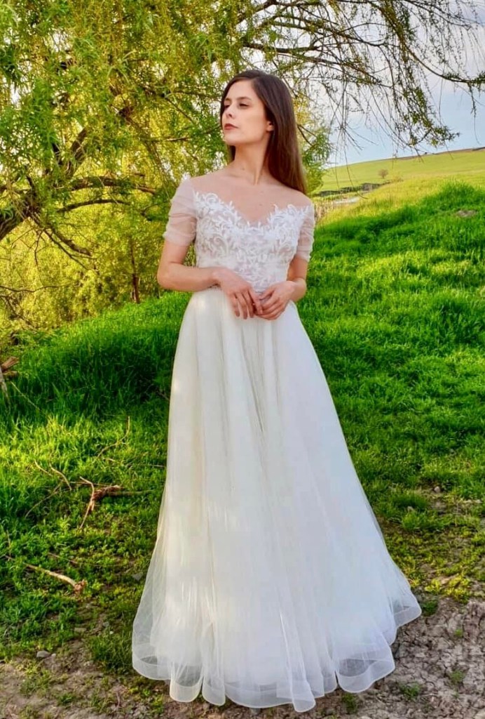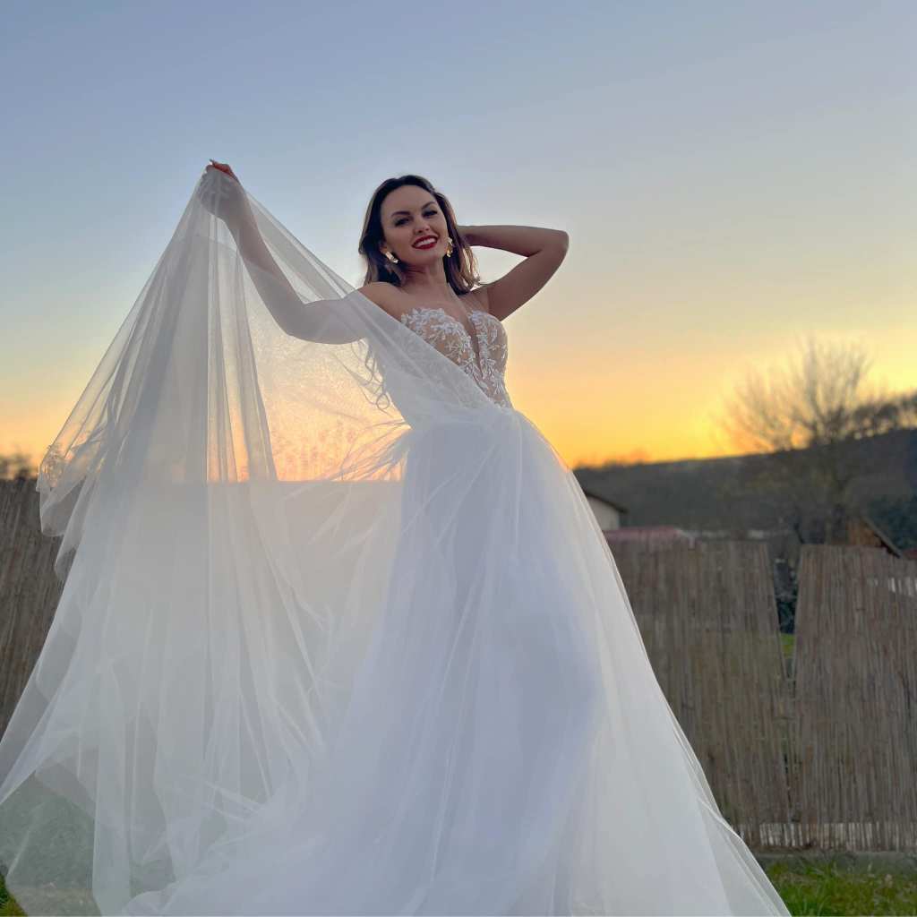 Această rochie de mireasă este realizată din voal și dantelă brodată italiană. Modelul acesta de rochie a fost lansat în 2022 pe mărimea 38 și este disponibil în stoc.