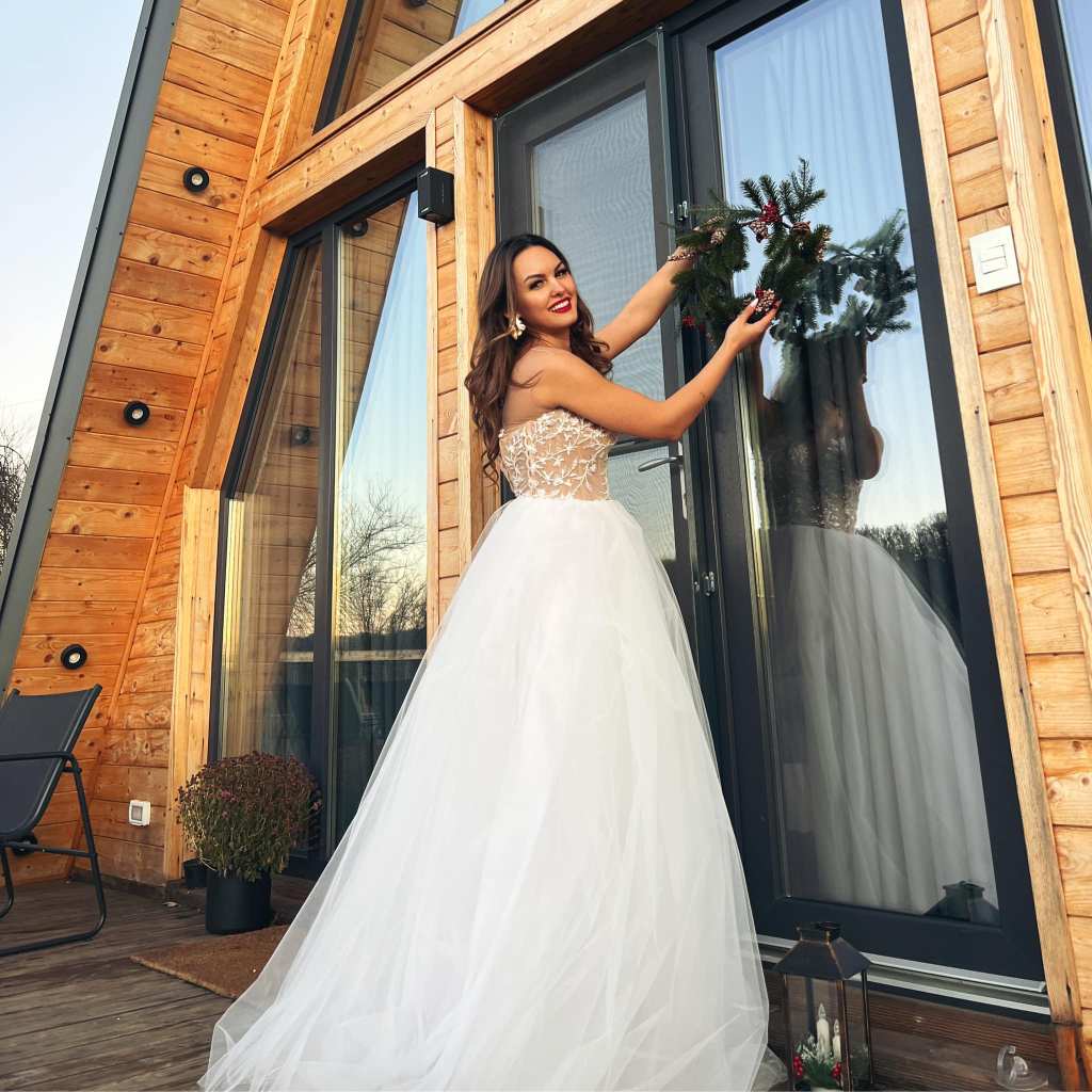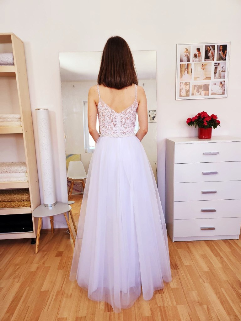 Această rochie de mireasă este realizată din tulle și dantelă lucrată manual. Bretelele și brâul rochiei sunt lucrate manual cu mărgele. Modelul acesta de rochie a fost lansat în 2022 pe mărimea 38 și este disponibil în stoc.