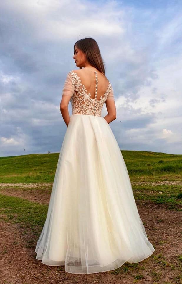 Această rochie de mireasă este confecționată din tulle și dantelă cu paiete lucrată manual. Modelul acesta de rochie a fost lansat în 2022 pe mărimea 38 și este disponibil în stoc. De asemenea rochia poate fi realizată personalizat după comandă și pe alte mărimi.