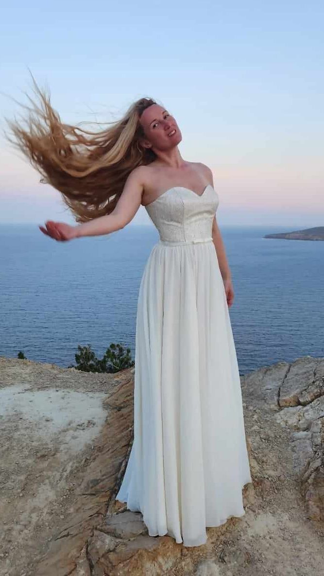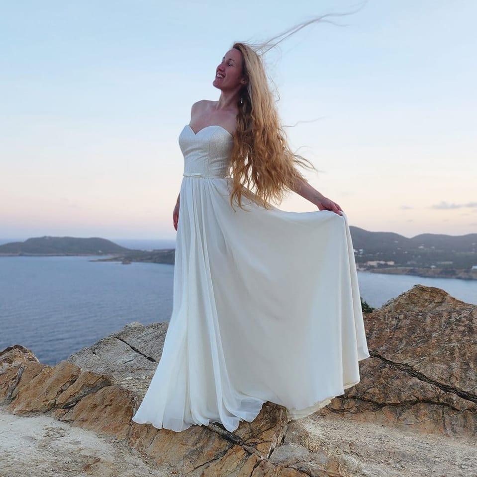 Această rochie de mireasă face parte din colecția ”Romance”. Partea de sus a rochiei e decorată cu dantelă și drapaj lucrate manual. Modelul acesta de rochie a fost lansat în 2022 pe mărimea 38 și este disponibil în stoc. De asemenea rochia poate fi realizată personalizat după comandă și pe alte mărimi.
