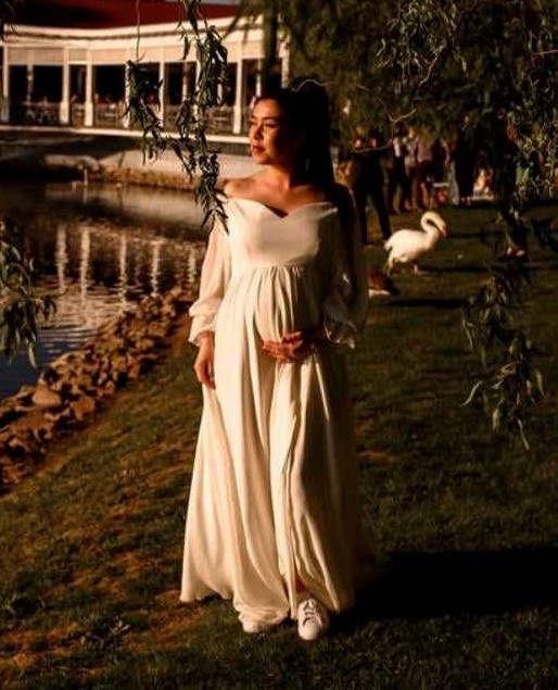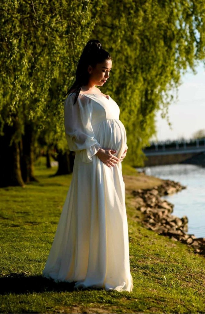 Această rochie de mireasă pentru gravide cu cloș este confecționată din voal. Mănecile lungi de inspirație tradițională dau un plus de eleganță acestui model realizat de atelierul nostru în 2020. Rochiile de mireasă pentru gravide se realizează aproape exclusiv după comandă iar atelierul nostru deține o experiență de peste 10 ani în realizarea unor astfel de rochii.