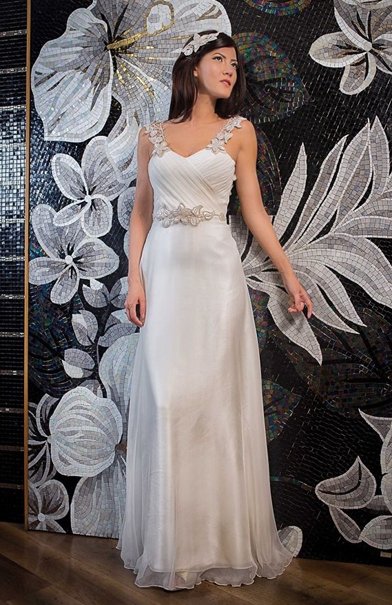 Această rochie de mireasă este realizată din mătase naturală. Drapajul rochiei este realizat manual și este decorat pe umeri cu dantelă 3D. Mânecile în stil roman aduc un plus de eleganță acestei rochii din portofoliul nostru din 2016.