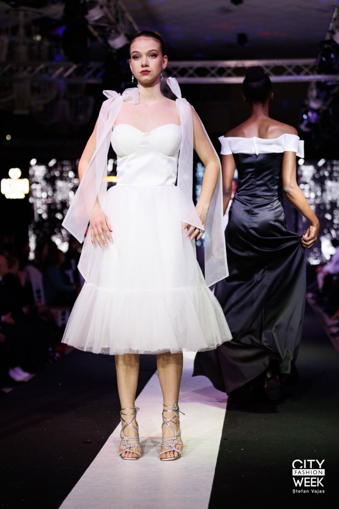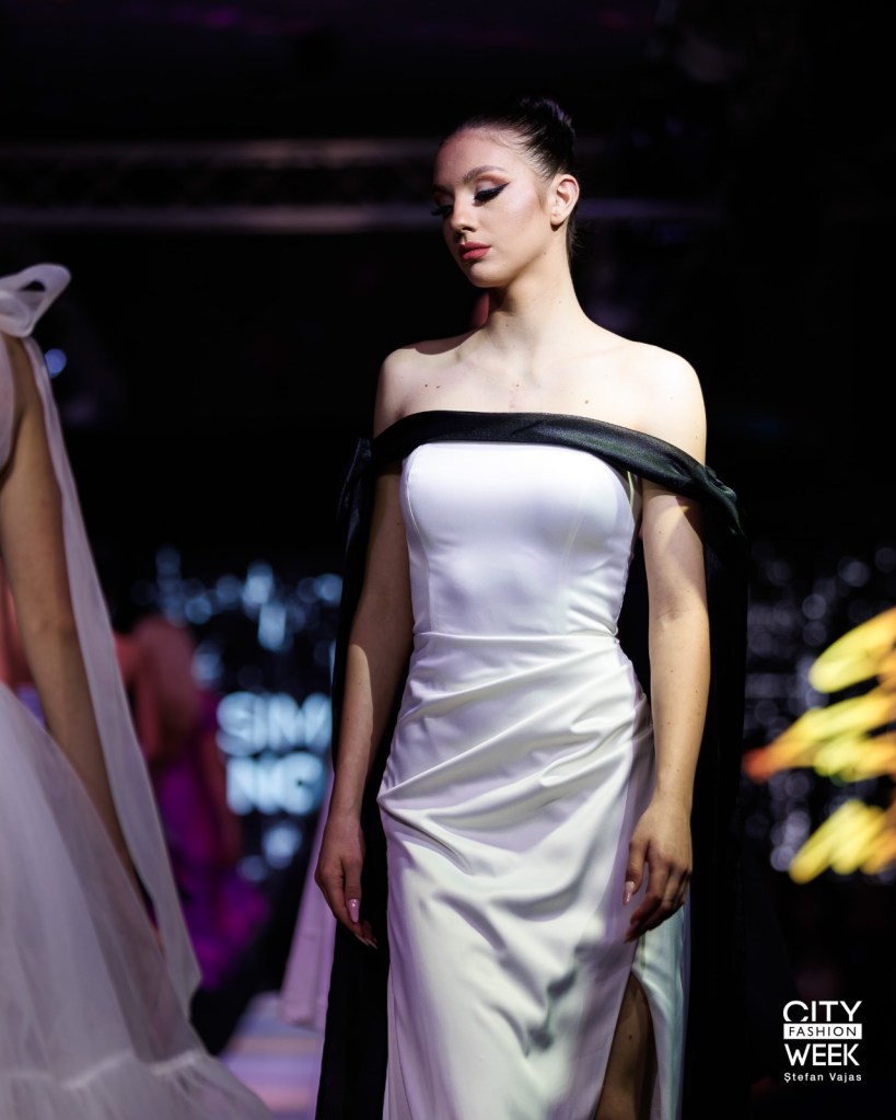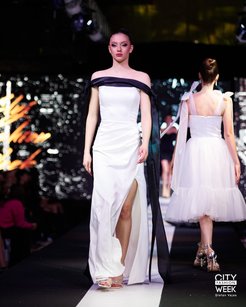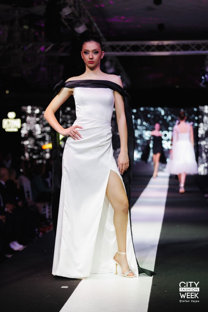 Rochia este realizată din tafta satinată ivoir și organza neagră și face parte din colecția ”Yin and Yang” 2024. Rochia este disponibilă în stoc.