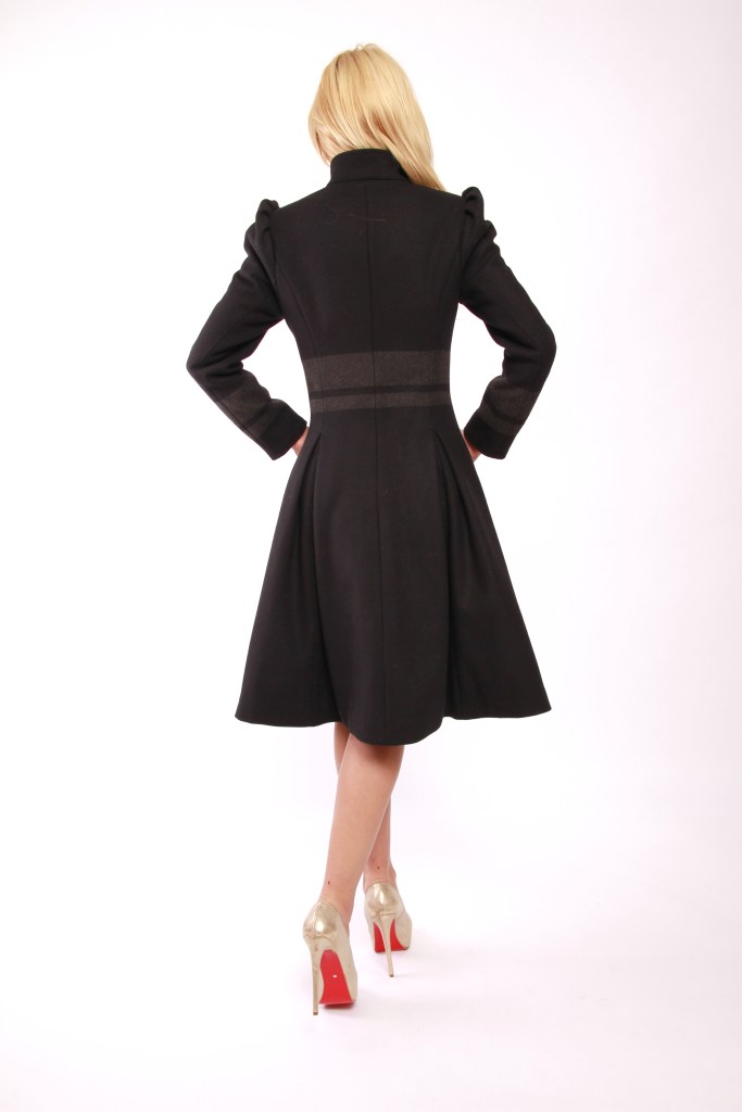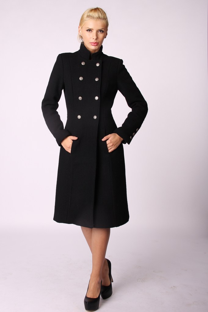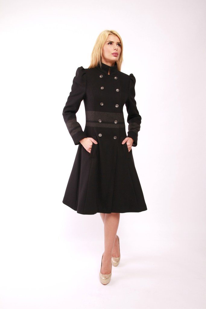 Palton negru din stofă cu lână și cu nasturi metalici.