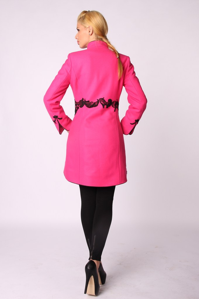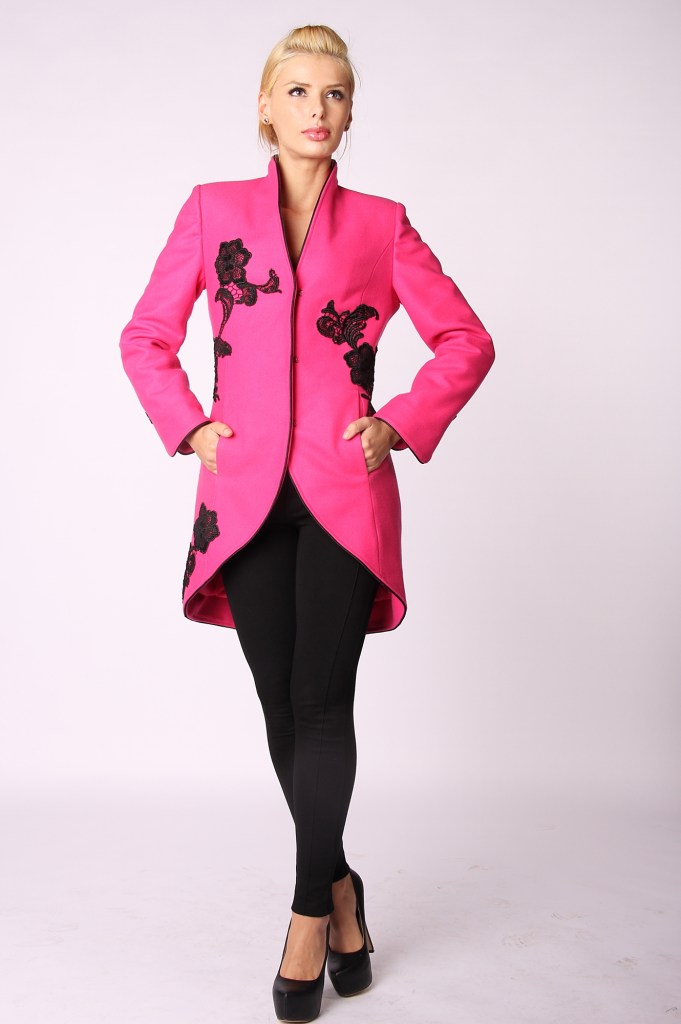 Palton fucsia din stofă cu lână și broderie neagră aplicată manual.