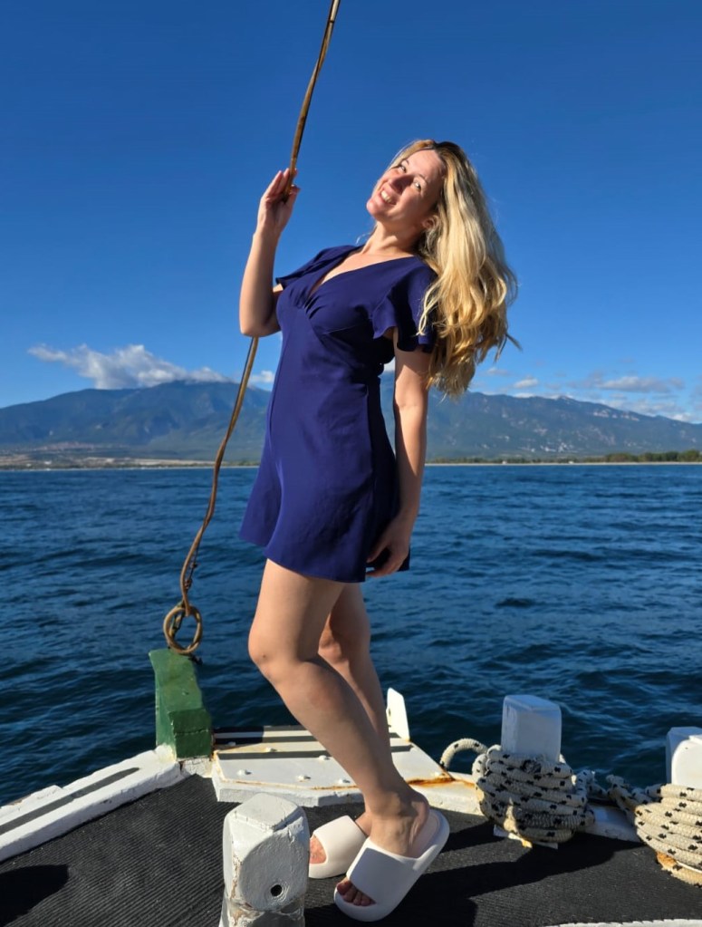 Bazerul albastru regal din mătase naturală este ideal ca o piesă lejeră pentru concediu.